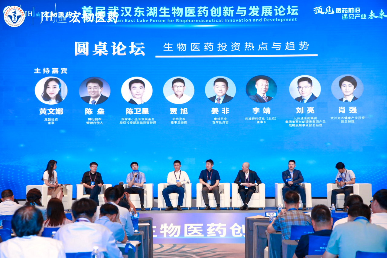 紧随主论坛之后的圆桌论坛以《生物医药投资热点与趋势》为主题,特邀龙磐投资董事黄文娜,博行资本管理合伙人陈垒,明熙资本董事总经理贾旭,康哲药业首席投资官姜非,药渡经纬信息(北京)董事长李靖,九州通医药集团董事长助理兼集团产品战略发展事业部总经理刘亮,武汉光谷健康产业投资副总经理肖强等投资与产业界精英,围绕生物医疗领域的投资该如何布局,赛道里的企业怎么突围,IPO发行的速度和价格变化给中后期被投项目带来的影响、产业资本如何助力生物医药企业发展等相关问题展开了热烈的讨论。